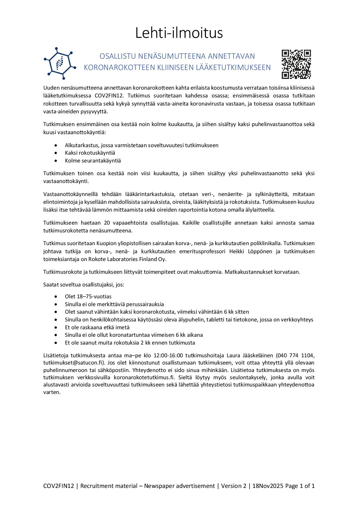 Tutkimuksessa testataan uutta nenän limakalvolle annettavaa lääkettä, selvitetään sen turvallisuutta ja tehoa koronavirusten aiheuttamia tartuntoja vastaan. Tutkimus tehdään Kuopiossa.
